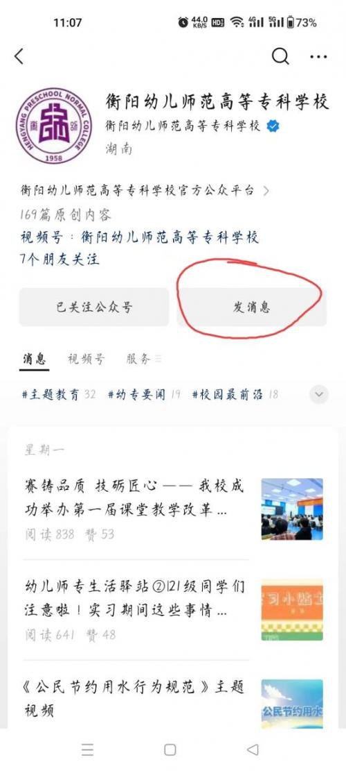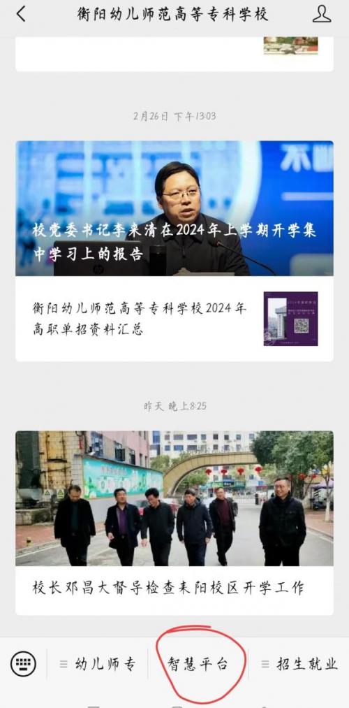 關(guān)注衡陽幼兒師范高等??茖W(xué)校微信公眾號,點擊發(fā)消息,點擊中間智慧平臺