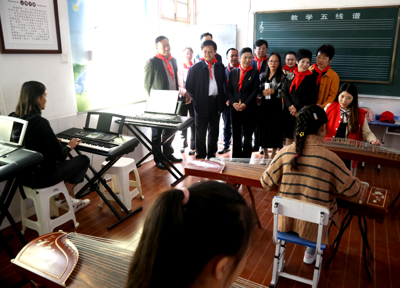 湖南省委宣傳部二級(jí)巡視員熊科文、衡陽(yáng)市委常委、宣傳部部長(zhǎng)張霞等省市領(lǐng)導(dǎo)在校領(lǐng)導(dǎo)李仲輝、蕭烽陪同下觀看我校義務(wù)支教志愿者為留守兒童上課。