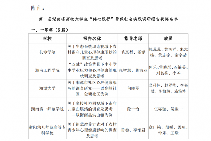 本次活動旨在進(jìn)一步發(fā)揮社會實(shí)踐在改進(jìn)大學(xué)生思想政治教育中的重要作用,促進(jìn)湖南省各高校學(xué)生主動參與社會心理服務(wù)體系建設(shè),激發(fā)大學(xué)生的社會責(zé)任感與時(shí)代使命感。評獎根據(jù)《第二屆湖南省高校大學(xué)生“健心踐行”暑假社會實(shí)踐調(diào)研的通知》(湘高心研會[2023]11 號)開展,經(jīng)各個(gè)高校選拔、專家評審,最終評選出了5篇一等獎,10 篇二等獎,20 篇三等獎。