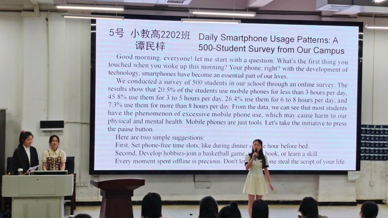 為了與省賽接軌,提升學(xué)生數(shù)據(jù)分析能力與英語(yǔ)應(yīng)用水平,本次賽事以“智慧互聯(lián)時(shí)代的青年畫(huà)像”為主題,以我校500名大學(xué)生日均手機(jī)使用時(shí)長(zhǎng)的調(diào)研數(shù)據(jù)為分析對(duì)象,經(jīng)過(guò)初賽和復(fù)賽選拔出的20位選手依托可視化統(tǒng)計(jì)圖表,多維度剖析調(diào)研結(jié)果。賽事采用“2分鐘演講+2分鐘即席問(wèn)答”模式,從內(nèi)容架構(gòu)、語(yǔ)言質(zhì)量、學(xué)術(shù)規(guī)范、舞臺(tái)表現(xiàn)四個(gè)維度綜合評(píng)定,重點(diǎn)考查數(shù)據(jù)解讀的邏輯嚴(yán)密性與語(yǔ)言表達(dá)規(guī)范性。最終來(lái)自小教高2203班的仇媛媛等4名同學(xué)獲得一等獎(jiǎng),小教2407班的寧嘉雯等6人摘得二等獎(jiǎng),另有10名選手獲得三等獎(jiǎng)。仇媛媛和學(xué)前2304班的王選艷分別摘得“最具創(chuàng)新提案獎(jiǎng)”和“最佳數(shù)據(jù)洞察獎(jiǎng)”兩項(xiàng)特別榮譽(yù)。(圖文/王芳幼)