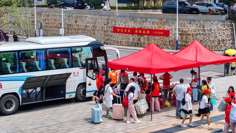 迎新大巴滿載著新生和家長(zhǎng)的期待