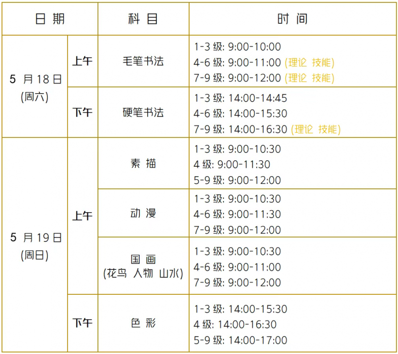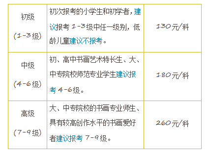 本次開(kāi)考科目為:毛筆書(shū)法、硬筆書(shū)法、素描、色彩、動(dòng)漫畫(huà),國(guó)畫(huà)(人物、山水、花鳥(niǎo)),各科目均開(kāi)考1-9級(jí)。