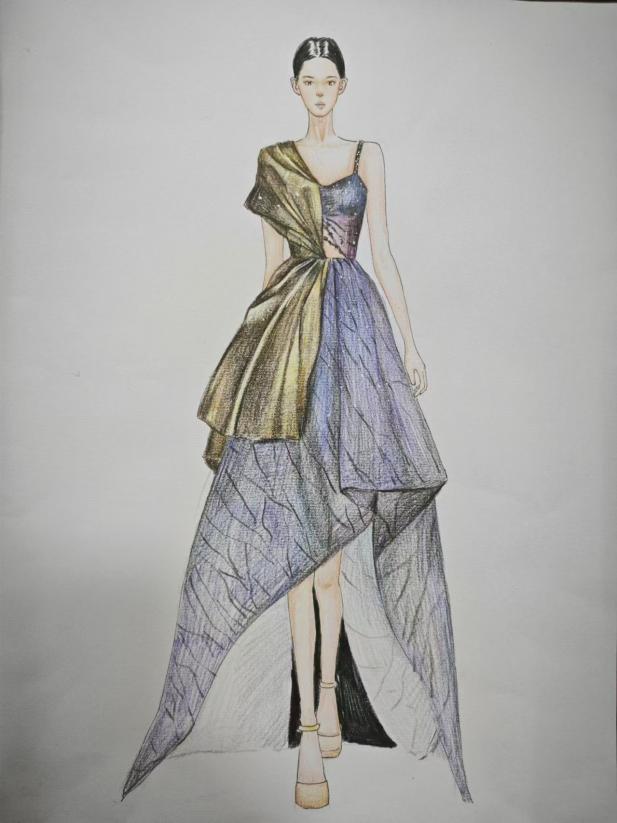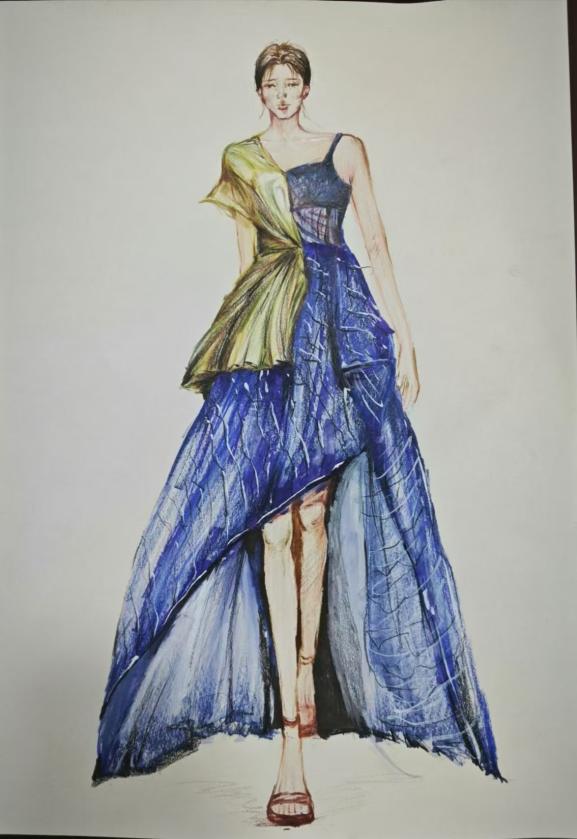 本次技能考核的內(nèi)容為現(xiàn)場(chǎng)抽簽決定,抽取內(nèi)容為《衡陽(yáng)幼兒師范高等??茖W(xué)校服裝與服飾設(shè)計(jì)專業(yè)技能考核題庫(kù)》的模塊一第一題,具體內(nèi)容是根據(jù)提供的服裝款式圖片(下圖左為圖一? 右為圖二),以手繪效果圖的形式表現(xiàn)服裝款式。手繪效果圖中人體動(dòng)態(tài)以正面或3/4側(cè)面為主,著色顏料主要為水粉顏料、水彩顏料、彩鉛或馬克筆,效果圖中服裝的色彩、面料質(zhì)地或圖案與提供的服裝款式圖片保持一致。效果圖繪畫于試卷正面。