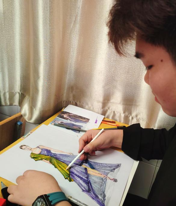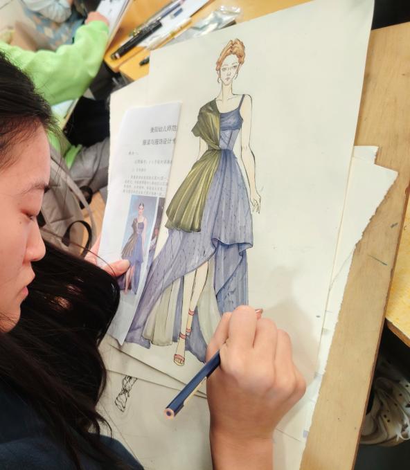 在技能考核現(xiàn)場(chǎng),同學(xué)們認(rèn)真思考、仔細(xì)繪畫,熟練使用手繪工具參與考核??忌鷤儺嫹▼故?、創(chuàng)意迭出,精心設(shè)計(jì)每一個(gè)細(xì)節(jié),充分展示出過(guò)硬的服裝設(shè)計(jì)才能與創(chuàng)意思維能力。