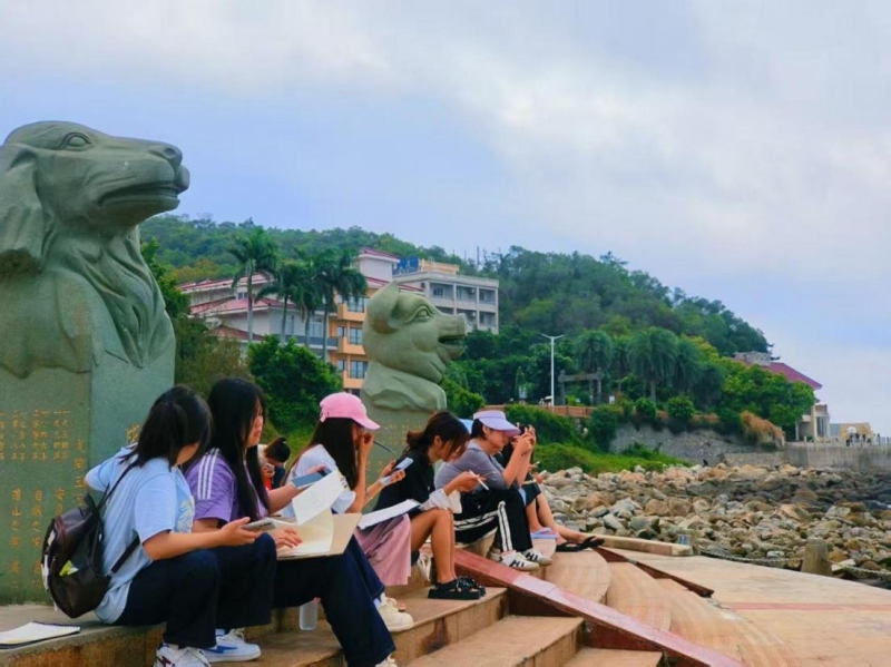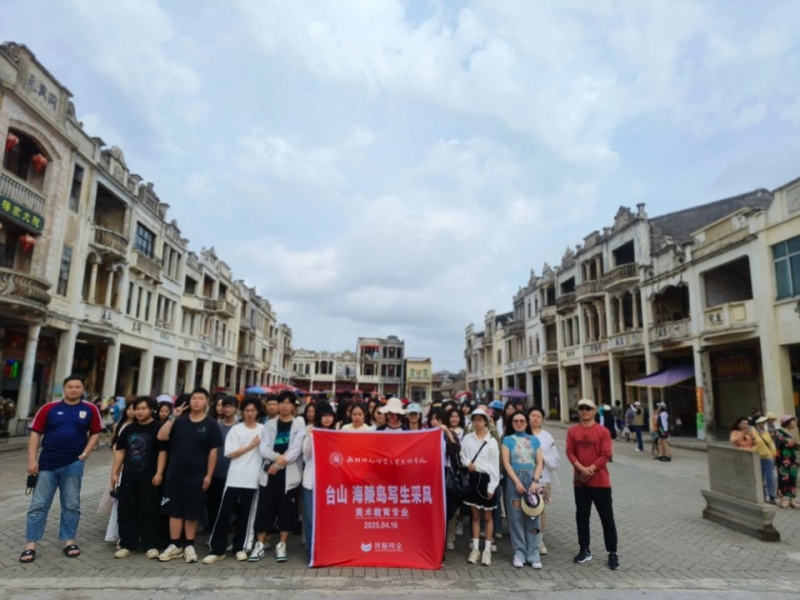 第二批2023級美術教育專業(yè)60余名師生進行了為期十天的廣東臺山與陽江的寫生之旅。在臺山梅家大院的百年騎樓群中,學生們以速寫定格灰雕與羅馬柱的歲月痕跡,名師鄭中凱現(xiàn)場示范水彩技法,詮釋“建筑是凝固的藝術史”;陽江海陵島的碧波銀沙間,丙烯繪制的漁船歸港圖與水墨暈染的潮汐韻律,展現(xiàn)傳統(tǒng)技法與現(xiàn)代審美的交融。師生白天觀摩名家創(chuàng)作,晚上則將客棧走廊化作“移動畫廊”,最終以800余件作品鐫刻僑鄉(xiāng)古韻與海疆詩意的雙重魅力。