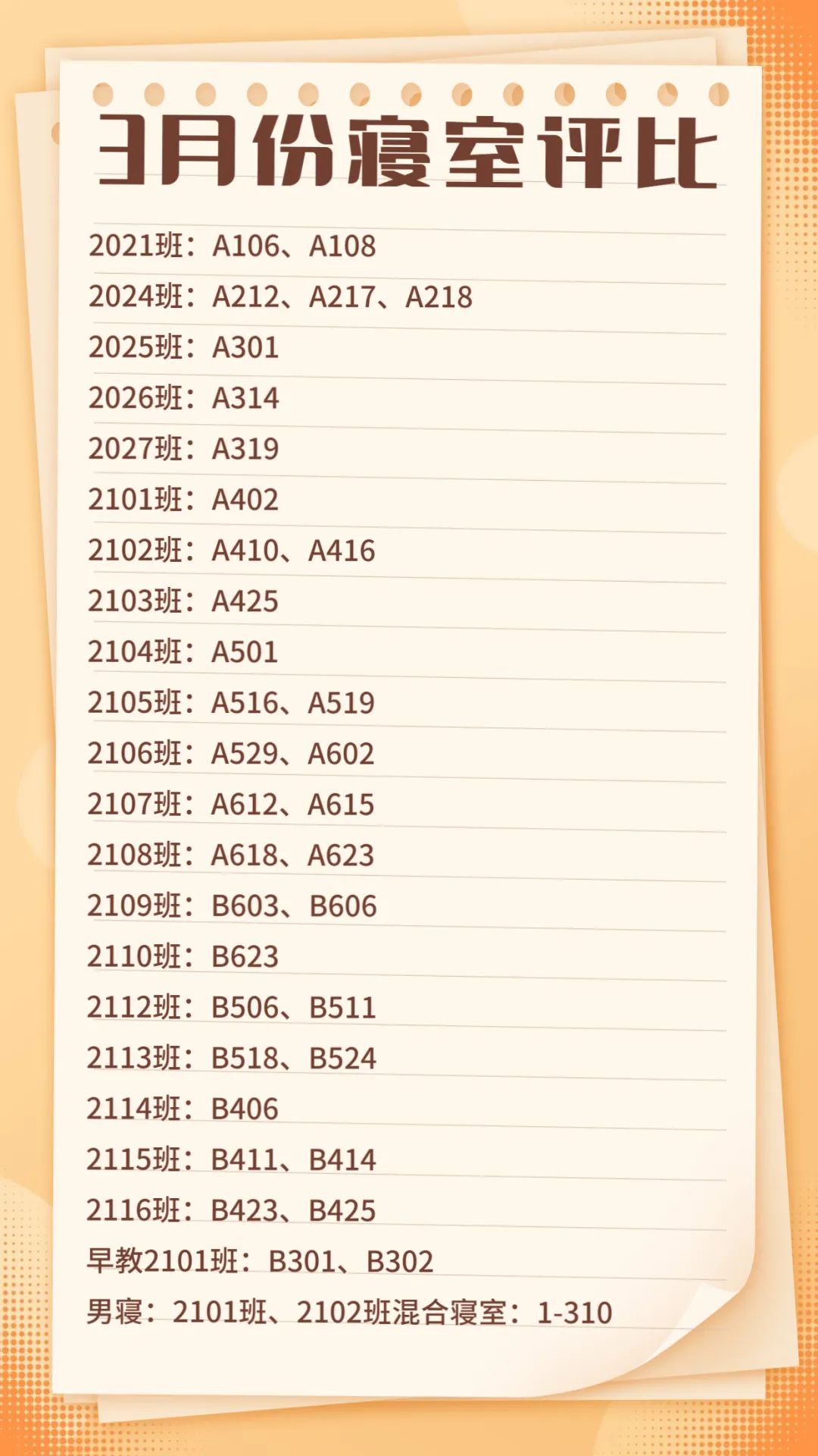 3月29日,宿管部按照日常慣例組織本學(xué)期第二次文明寢室評(píng)選。前期通報(bào)過(guò)的寢室有了很大的改善,其他寢室更加不甘示弱,不僅衛(wèi)生一塵不染,還營(yíng)造了獨(dú)特的寢室文化。宿管部成員工作細(xì)致認(rèn)真,并對(duì)寢室安全、衛(wèi)生狀況做了詳細(xì)的檢查。在經(jīng)過(guò)慎重的評(píng)比后,優(yōu)秀寢室名單出爐啦。