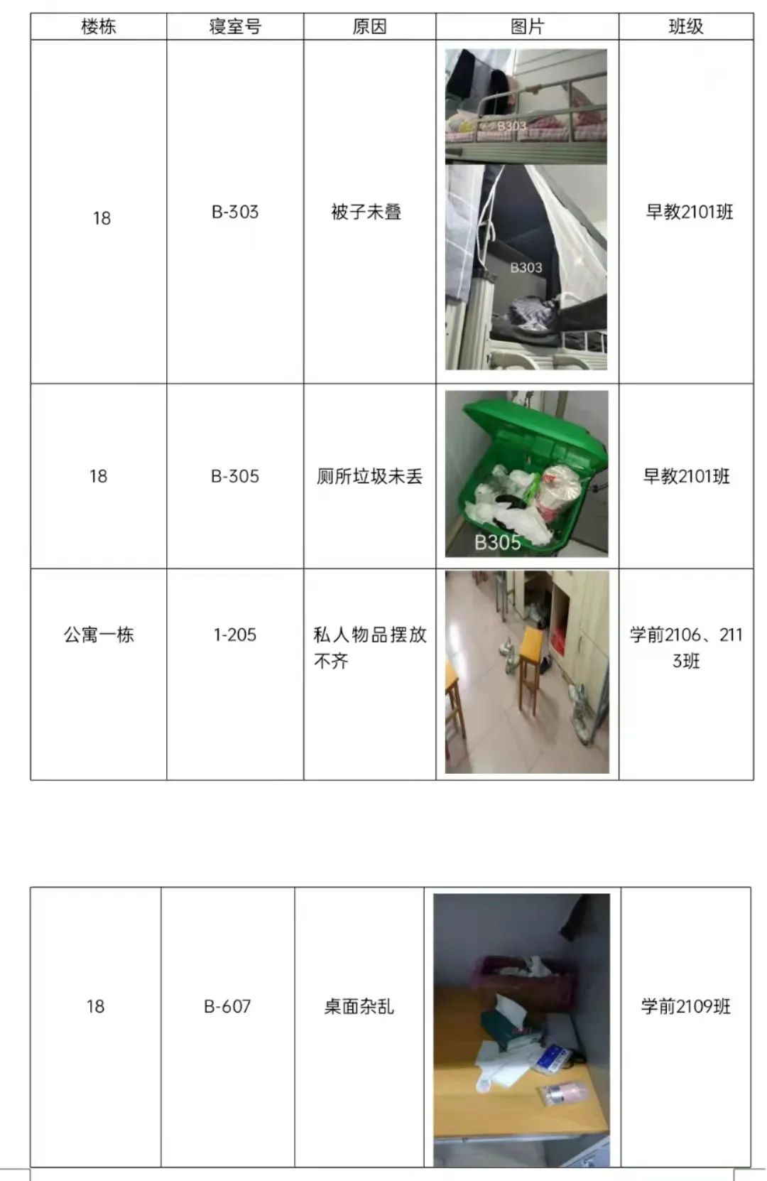 寢室作為一個(gè)最小的獨(dú)立集體單位,是寢室成員的喜好與個(gè)性展示的舞臺(tái)。 為了給同學(xué)們搭建一個(gè)展示自我個(gè)性,風(fēng)采的舞臺(tái),增強(qiáng)同學(xué)們的團(tuán)結(jié)協(xié)作精神,使同學(xué)們養(yǎng)成良好的生活、衛(wèi)生習(xí)慣,培養(yǎng)同學(xué)們創(chuàng)造美、保持美的能力和習(xí)慣。我院學(xué)生會(huì)開(kāi)展了第三次學(xué)前教育學(xué)院優(yōu)秀文明寢室評(píng)比活動(dòng)。經(jīng)過(guò)3月28號(hào)老師和同學(xué)的評(píng)選,3月份優(yōu)秀文明寢室評(píng)比活動(dòng)現(xiàn)已結(jié)束。現(xiàn)將獲獎(jiǎng)寢室公布如下: 恭喜以上獲獎(jiǎng)的36個(gè)寢室 希望獲獎(jiǎng)寢室繼續(xù)發(fā)揚(yáng) 也希望其他寢室向以上寢室學(xué)習(xí) 不斷吸取優(yōu)點(diǎn)、改進(jìn)不足 不斷營(yíng)造良好的學(xué)習(xí)和生活環(huán)境 為寢室文化建設(shè)事業(yè)錦上添花 接下來(lái)我們一起來(lái)瞧瞧文明寢室的風(fēng)采吧 2116班B423 2114班B406 2116班B425 2027班A319 2101、2102混寢1-310 2102班A410 2105班A516 2021班A106 三月,萬(wàn)象更新,春暖花開(kāi),姹紫嫣紅。可是在倒春寒的搗亂下,同學(xué)們的衣服更換一日四季,導(dǎo)致本來(lái)就不大的宿舍更加擁擠,混亂不堪。疫情強(qiáng)勢(shì)來(lái)襲,保持宿舍衛(wèi)生干凈整潔,室內(nèi)空氣流通,減少細(xì)菌滋生迫在眉睫。為了同學(xué)們的身心健康,督促同學(xué)們養(yǎng)成良好的個(gè)人衛(wèi)生習(xí)慣,學(xué)前教育學(xué)院宿管部對(duì)所有寢室進(jìn)行檢查,發(fā)現(xiàn)有一些宿舍還需要整改。希望同學(xué)們共同維護(hù)、保護(hù)、愛(ài)護(hù)自己溫馨的“家”。 需要整改的寢室 此次活動(dòng),既培養(yǎng)了同學(xué)們定期清潔寢室衛(wèi)生的意識(shí),又增強(qiáng)了寢室的凝聚力,營(yíng)造出溫馨潔凈的寢室氛圍,同時(shí)全力配合做好學(xué)校的防疫工作,宿管部會(huì)不懈地堅(jiān)持和奮斗,爭(zhēng)取在未來(lái)把工作做得更好,為學(xué)生們的健康、安全保駕護(hù)航。