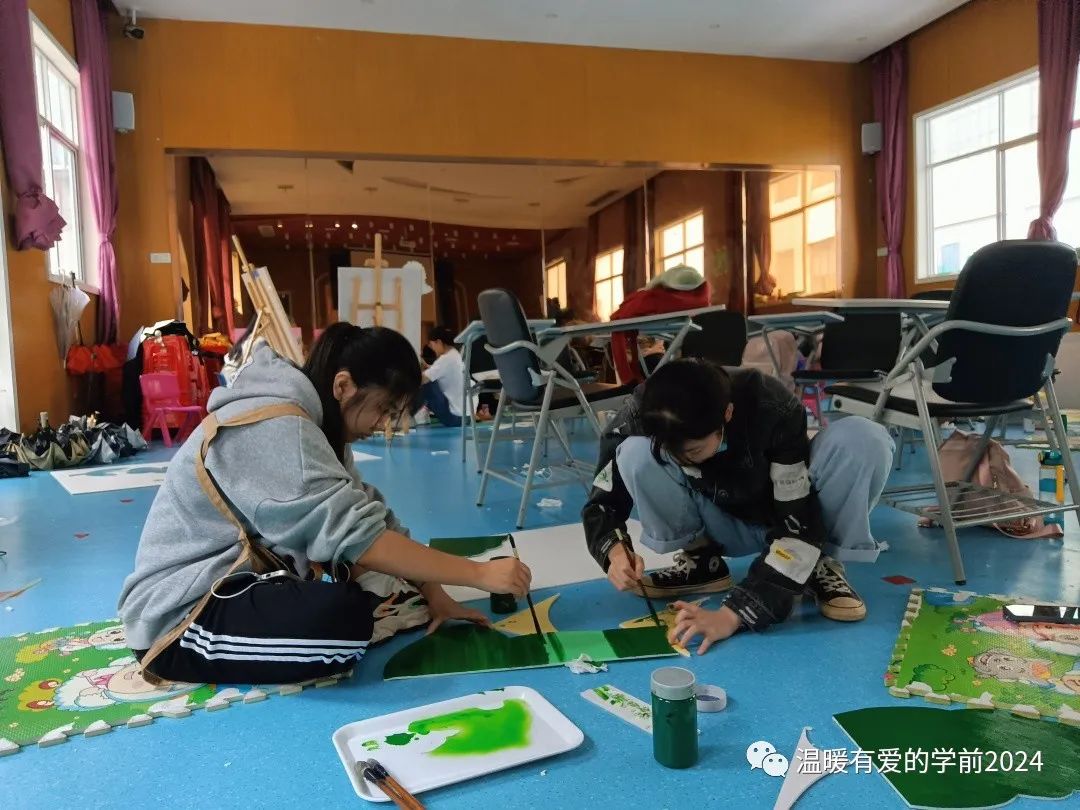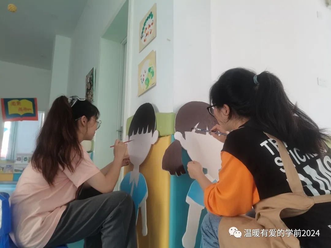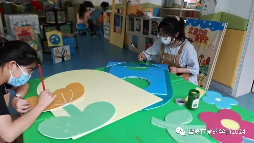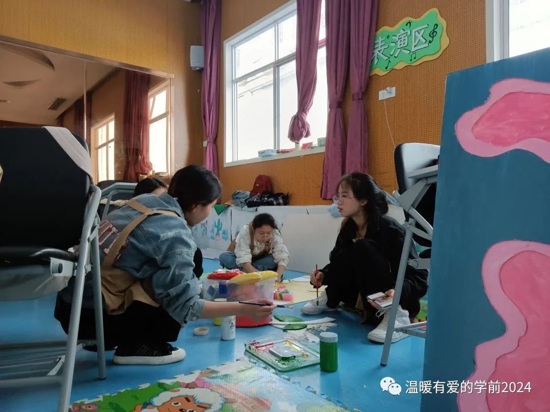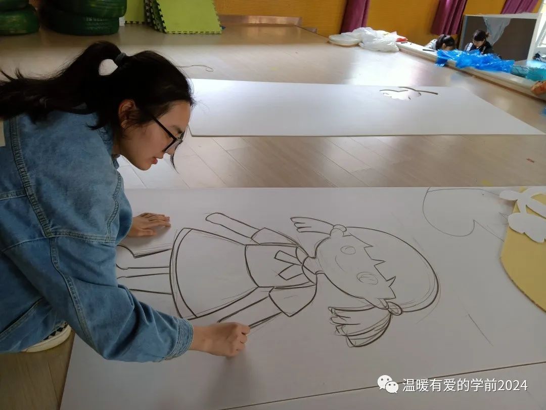 作為整個環(huán)創(chuàng)的組織人員,前期我們對整個環(huán)創(chuàng)進(jìn)行了任務(wù)分組,將每個任務(wù)責(zé)任到組,同時安排小組長來監(jiān)督質(zhì)量與進(jìn)度。在展開過程中,我們分到的任務(wù)是大背景墻,其中包括幼兒立牌與主題展板。制作幼兒立牌的過程是不易的,立牌高度和小朋友的高度差不多,這在結(jié)構(gòu)與造型方面的要求比較高,在進(jìn)行裁剪時,我們反復(fù)打磨,最后終于呈現(xiàn)出來一個不錯的效果。在展板的制作過程中,我們首先將展板的結(jié)構(gòu)拆分出來,主要分為底板和地板的裝飾物,然后將這些結(jié)構(gòu)分別經(jīng)過畫線稿、裁剪、涂色、組合粘貼等步驟制作出來。——冷鈺玲、劉慧英
