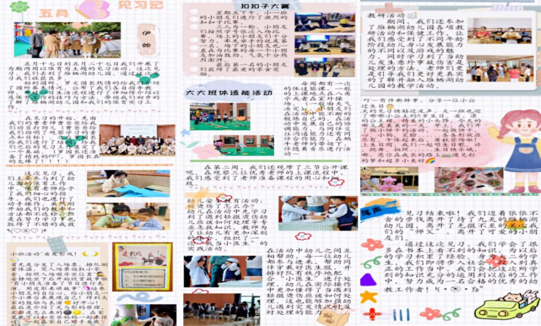 紙上得來(lái)終覺(jué)淺,絕知此事要躬行,在幼兒園見(jiàn)習(xí)的幾天時(shí)間里,小老師們?cè)诒Sぷ?、環(huán)境創(chuàng)設(shè)、活動(dòng)組織等方面都進(jìn)行了實(shí)踐,在班級(jí)老師的細(xì)心指導(dǎo)下,小老師們逐漸熟悉各項(xiàng)工作,從青澀到熟練,從理論到實(shí)踐……