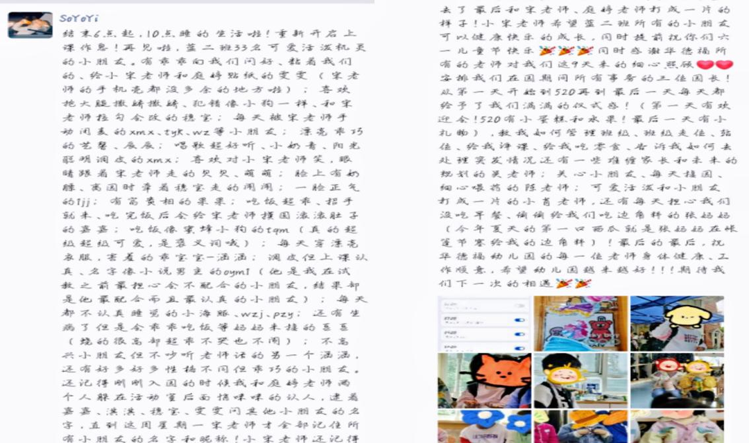 感受到愛(ài)的同時(shí)收獲也很多,不光對(duì)幼兒園一日生活工作有了更清晰的認(rèn)知,對(duì)于幼兒園教育和保育工作也有了整體認(rèn)知,甚至還能比較好的組織一個(gè)小小的活動(dòng)。
