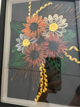 假期,我在小紅書(shū)看見(jiàn)用衍紙做的美工作品,覺(jué)得特別好看,于是把家里落灰的衍紙拿了出來(lái)?,按圖片的步驟一步一步做起來(lái)。剛開(kāi)始只是因?yàn)樾迈r感,到了后面就吃不消了,一朵小小的花就要做幾個(gè)小時(shí)!好在最后也沒(méi)有放棄,看到成品時(shí)我頓時(shí)有了滿(mǎn)滿(mǎn)的成就感,也明白了堅(jiān)持的含義!