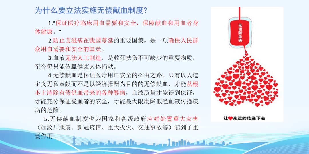無償獻(xiàn)血是終身的榮譽(yù),獻(xiàn)血者也會受到社會的尊重和愛戴,是一份造福社會的公益事業(yè)。捐獻(xiàn)一份血液,奉獻(xiàn)一份愛心,讓我們用青春的熱血,筑起生命的長橋!