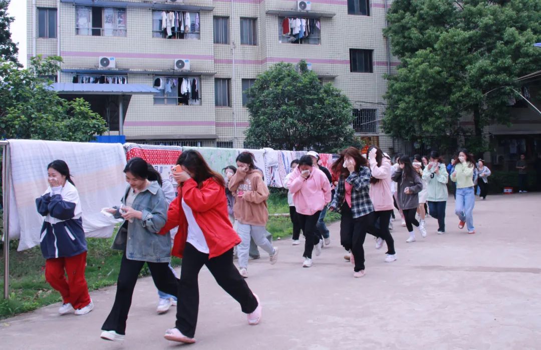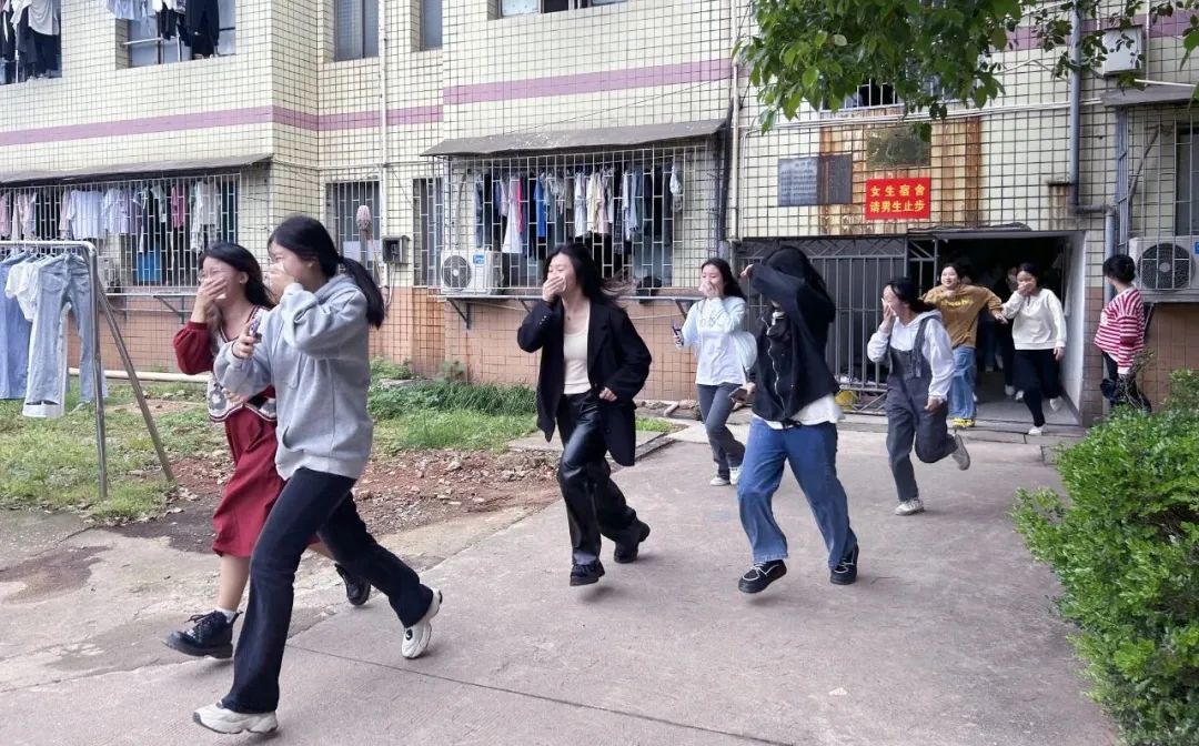 演練時(shí)間一到,宿舍樓內(nèi)響起了急促的“火警”警報(bào)聲,在輔導(dǎo)員的組織下,學(xué)生用濕毛巾或衣袖捂住口鼻、俯身小跑,按照規(guī)定路線井然有序地跑下樓梯,奔向教室。樓梯的每一個(gè)拐角都有老師看護(hù)、引導(dǎo),全系學(xué)生全部及時(shí)從宿舍安全撤離到教學(xué)樓。最后輔導(dǎo)員清點(diǎn)人數(shù),報(bào)告疏散情況,整個(gè)演練過程安全、快速、有序地進(jìn)行。