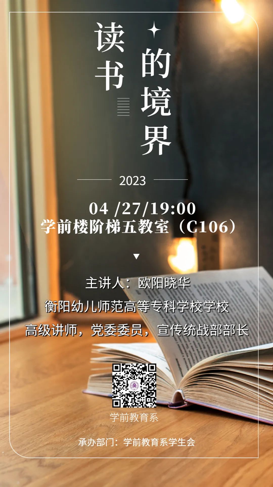 為傳承楚怡職教精神,推動形成愛讀書、讀好書、善讀書的濃厚氛圍。學前教育系特舉辦“讀書的境界”主題講座,邀請衡陽幼兒師范高等??茖W校高級講師,黨委委員,宣傳統(tǒng)戰(zhàn)部部長歐陽曉華擔任本次講座主講人,帶領同學們領略讀書的各種不同境界,期待同學們的參加。