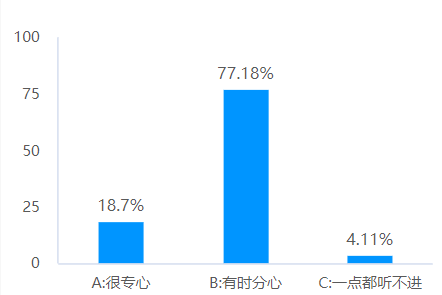 根據(jù)調(diào)查結(jié)果顯示,有77.18%的學(xué)生會有一點心不在焉,18.7%的學(xué)生專心聽課。對此,我系將時刻提醒學(xué)生注意勞逸結(jié)合,適當(dāng)?shù)尼尫艑W(xué)習(xí)的壓力,可以通過向老師請教,解除自己的困惑,從而激發(fā)學(xué)生們在課堂學(xué)習(xí)的積極性。