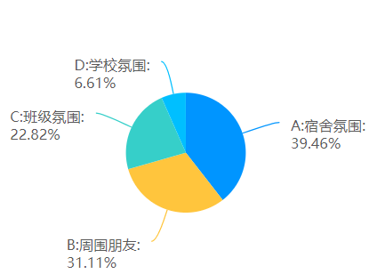 調(diào)查結(jié)果顯示,認(rèn)為宿舍氛圍影響最大的學(xué)生最多。良好的學(xué)習(xí)氛圍對人有熏陶作用和約束作用,當(dāng)我們置身濃濃的學(xué)習(xí)氛圍之中,潛移默化得就會對學(xué)習(xí)產(chǎn)生興趣。我系將會多舉行關(guān)于學(xué)習(xí)的活動,讓同學(xué)們在良好的學(xué)習(xí)氛圍下樹立正確的發(fā)展道路,做到朋友、室友之間共同努力、攜手共進(jìn)的美好局面。