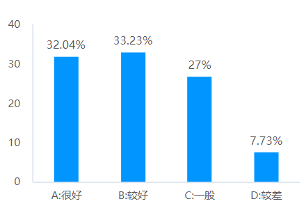 根據(jù)調(diào)查結(jié)果顯示,我系六成學(xué)生認(rèn)為宿舍學(xué)習(xí)氛圍還不錯,其中32.04%的學(xué)生感覺非常好。室友通常是與自己接觸時間最多的同學(xué),而宿舍氛圍也是影響校園學(xué)習(xí)氛圍的重要因素之一,現(xiàn)仍有8%的學(xué)生認(rèn)為宿舍學(xué)習(xí)氛圍不夠濃郁,為此我系將繼續(xù)加強宿舍的管理工作,增強學(xué)生在學(xué)習(xí)態(tài)度的轉(zhuǎn)變,從而增強宿舍的學(xué)習(xí)氛圍。