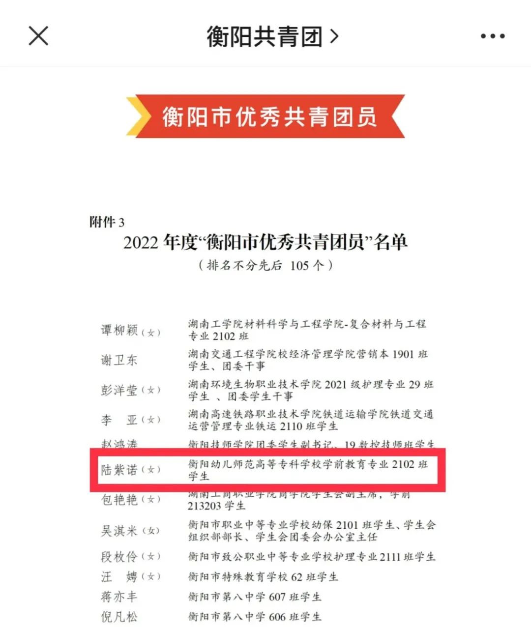 2023年5月被評(píng)為2022年度“衡陽市優(yōu)秀共青團(tuán)員”