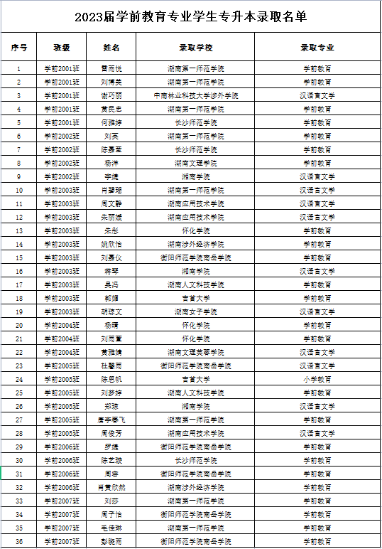 2023年湖南省普通高等學(xué)校專升本考試錄取工作基本結(jié)束,我系喜報(bào)頻傳。本次考試我系共有36名應(yīng)屆畢業(yè)生順利通過考試,分別被湖南第一師范學(xué)院、吉首大學(xué)、湖南文理學(xué)院等十二所本科院校錄取。其中學(xué)前2003班10人升本成功,成為我系升本人數(shù)最多的班級(jí)。