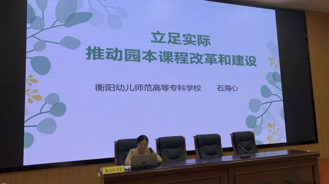 衡陽幼兒師范高等??茖W(xué)校學(xué)前教育系石海心主任講座題目是《立足實際,推進(jìn)園本課程改革和建設(shè)》。石主任提出了四個問題引發(fā)園長和老師們思考討論:何為園本課程?園本課程建設(shè)的出發(fā)點是什么?哪些課程資源是可以被開發(fā)和利用的?園本課程建設(shè)的成效和困境?
