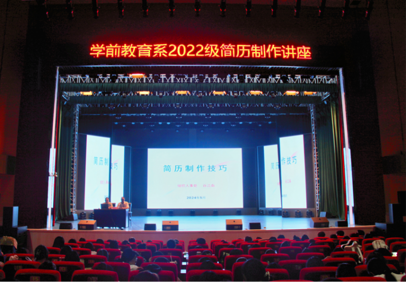 5月17日,由學(xué)前教育系主辦的“2022級(jí)簡(jiǎn)歷制作講座”在大禮堂順利進(jìn)行,本次講座由學(xué)前教育系主任楊鈺鋒主持,組織人事處谷江南老師主講。
