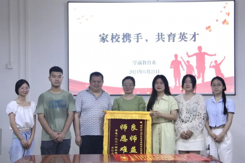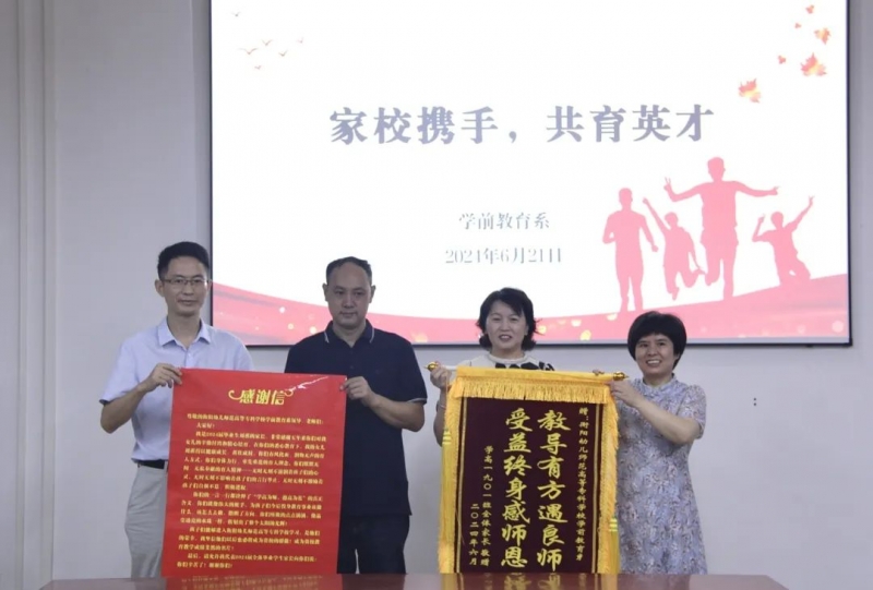 2024年6月21日上午,學前高1901班五年制公費師范生及學生家長向學前教育系送錦旗、謝師恩,學前教育系黨總支書記鄧艷華、主任楊鈺鋒、專職副書記馬奕斌、副主任石海心、副主任鄒文姣、班主任曹文生老師出席現場。