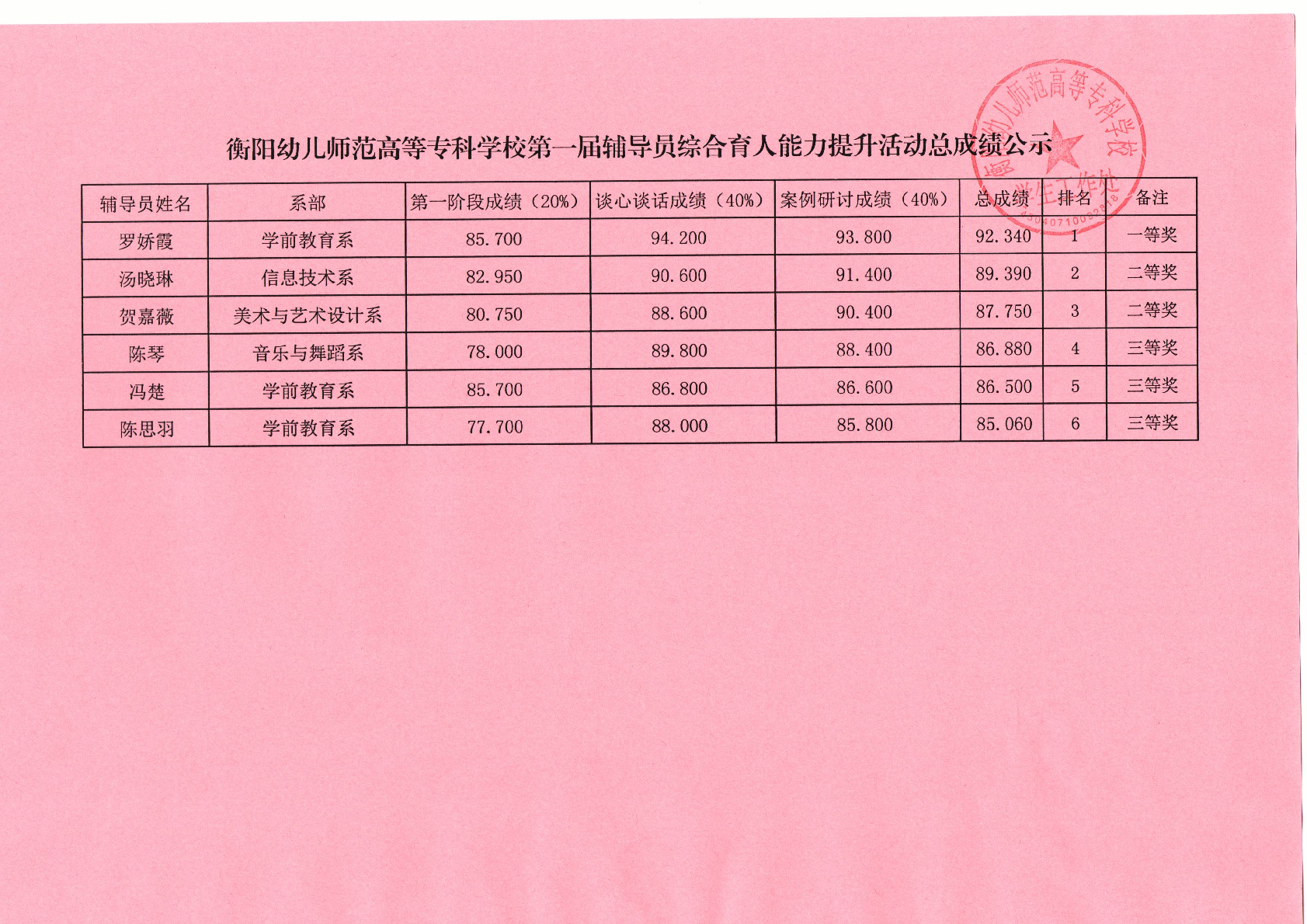 衡陽幼兒師范高等專科學(xué)校第一屆輔導(dǎo)員綜合育人能力提升活動(dòng)總成績公示