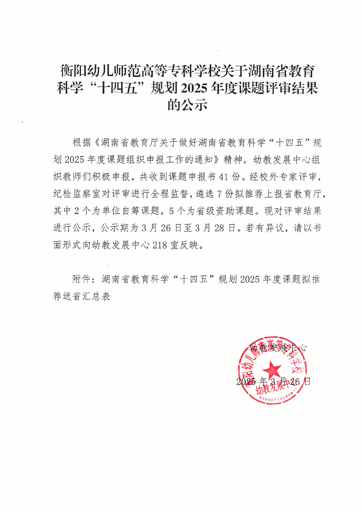 衡陽幼兒師范高等??茖W(xué)校關(guān)于湖南省教育科學(xué)“十四五”規(guī)劃2024年度課題評審結(jié)果的公示