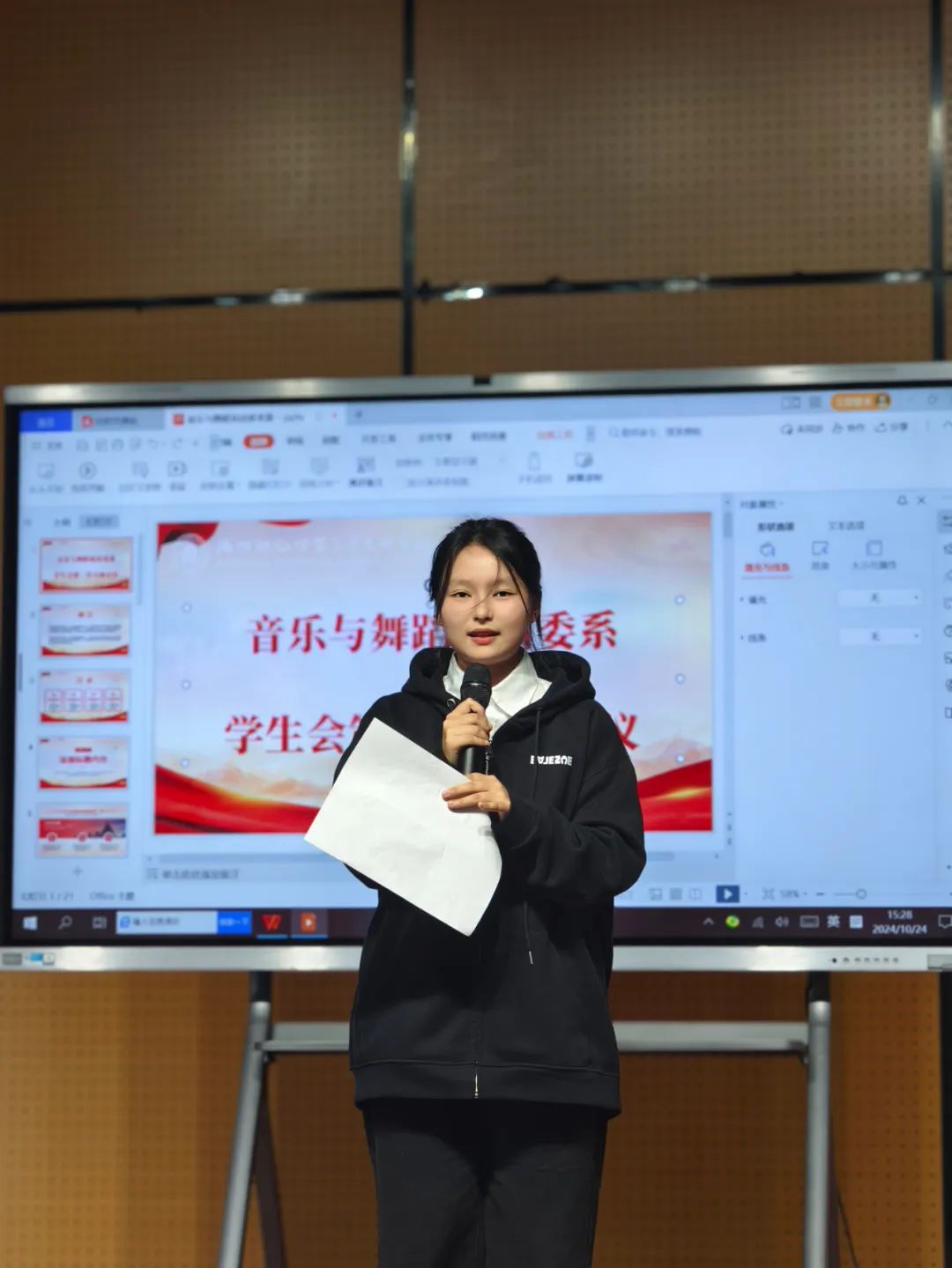 戴澤鵬說學(xué)生會(huì)就是一個(gè)大家庭,系部給了我們一個(gè)廣闊的平臺(tái),在這個(gè)平臺(tái)我們不用擔(dān)心孤單無助,因?yàn)檫@里有我們的良心益友。在學(xué)習(xí)上,在生活上,我們都能感受到這個(gè)大家庭的溫柔。我身處勞動(dòng)部,在全體同學(xué)的通力合作下,使得勞動(dòng)部成為主席團(tuán)最放心的部門之一。最后,希望24級(jí)學(xué)生會(huì)新成員可以以每位優(yōu)秀的部長(zhǎng)和主席團(tuán)為榜樣,積極努力的工作,共建音舞系未來更好的發(fā)展!學(xué)生干部代表宣傳部副部長(zhǎng)向瑋發(fā)言