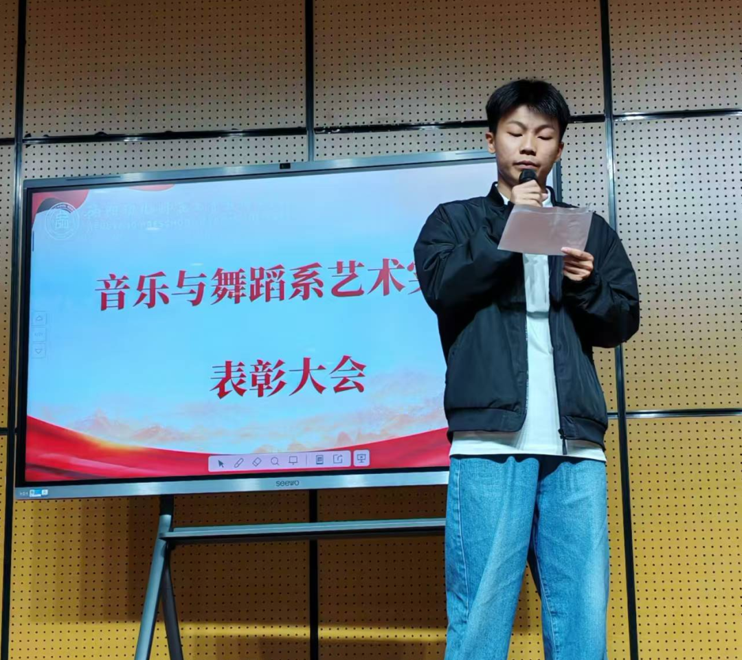 這些同學用行動詮釋了藝術的魅力和價值,每一個榮譽的背后都有著不為人知的付出和努力。演員代表全小明上臺跟大家分享他的這段經(jīng)歷:“當他被選中成為開幕式群演演員時 ,心情非常激動,因為他想為湖南省第三屆旅游發(fā)展大會—衡陽,這座我們所在的城市,貢獻一份自己的力量。排練那段時間正值酷暑季節(jié),他們卻處在密閉的體育館內(nèi)十分炎熱地進行舞蹈訓練。幾乎天天都去排練,有時凌晨才結(jié)束”。但辛苦堅持總是值得的,最終他們呈現(xiàn)出一個個令人滿意節(jié)目。最后全小明希望新生們也能積極參與各項活動,積累更多實踐知識。