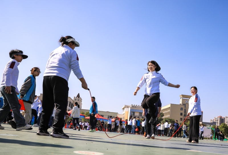 400多名教職工分別參加競速長繩、擊鼓同心、齊心投籃和趣味足球等四個(gè)項(xiàng)目的角逐。在競速長繩項(xiàng)目中,老師們身姿矯健,輕盈躍動(dòng),展現(xiàn)了不凡的協(xié)調(diào)能力和默契配合。每一次成功的跳躍,贏得現(xiàn)場觀眾熱烈鼓掌。擊鼓同心游戲更是考驗(yàn)教職工的團(tuán)隊(duì)協(xié)作能力。各組選手手握鼓繩,通過鼓面全神貫注地?fù)舸蚓W(wǎng)球,節(jié)奏感十足。每一次精準(zhǔn)的敲擊,都凝聚著團(tuán)隊(duì)的智慧,展現(xiàn)了教職工們團(tuán)結(jié)一心、共克時(shí)艱的精神風(fēng)貌。齊心投籃比賽中,老師們分組協(xié)作,投籃動(dòng)作精準(zhǔn)有力?;@球在空中劃出一道道優(yōu)美的弧線,準(zhǔn)確落入籃筐,贏得了陣陣喝彩。趣味足球更是將現(xiàn)場氣氛推向了高潮。老師們腳法嫻熟,努力向高分沖刺。也有左右開工,卻顆粒無收,但大家都盡情享受著趣味足球帶來的快樂與激情。