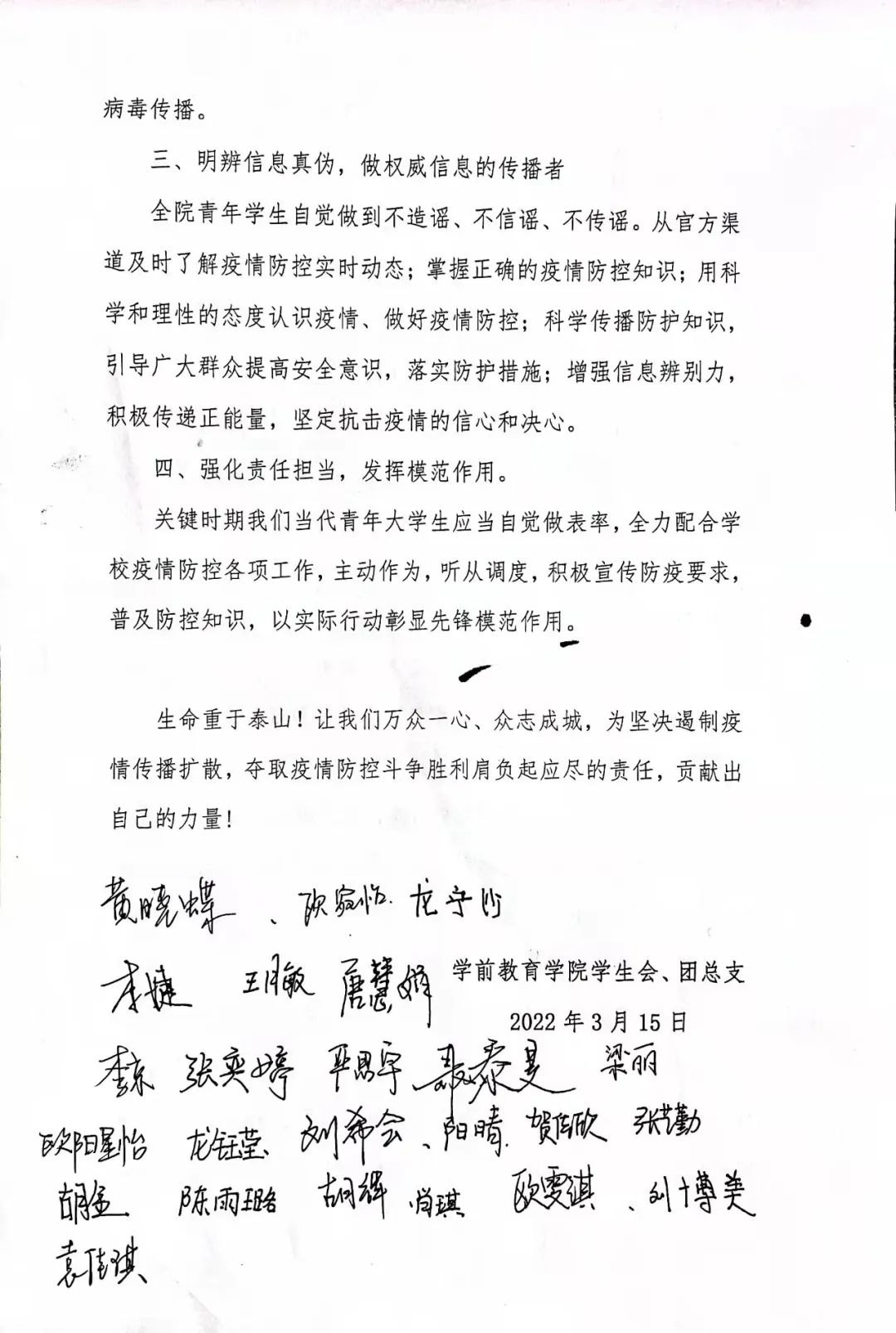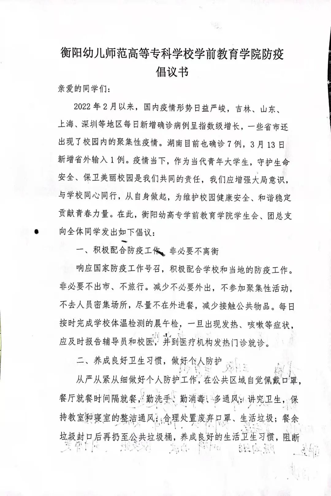 2022年2月以來,國內(nèi)疫情形勢日益嚴(yán)峻,吉林、山東、上海、深圳等地區(qū)每日新增確診病例呈指數(shù)級(jí)增長,一些省市還出現(xiàn)了校園內(nèi)的聚集性疫情。湖南目前也確診7例,3月13日新增省外輸入1例。疫情當(dāng)下,作為當(dāng)代青年大學(xué)生,守護(hù)生命安全、保衛(wèi)美麗校園是我們共同的責(zé)任,我們應(yīng)增強(qiáng)大局意識(shí),與學(xué)校同心同行,從自身做起,為維護(hù)校園健康安全、和諧穩(wěn)定貢獻(xiàn)青春力量。在此,衡陽幼高專學(xué)前教育學(xué)院學(xué)生會(huì)、團(tuán)總支向全體同學(xué)發(fā)出如下倡議: 一、積極配合防疫工作,非必要不離衡 響應(yīng)國家防疫工作號(hào)召,積極配合學(xué)校和當(dāng)?shù)氐姆酪吖ぷ?。非必要不出市、不旅行。減少不必要外出,不參加聚集性活動(dòng),不去人員密集場所,盡量不在外進(jìn)餐,減少接觸公共物品。每日按時(shí)完成學(xué)校體溫檢測的晨午檢,一旦出現(xiàn)發(fā)熱、咳嗽等癥狀,應(yīng)及時(shí)報(bào)告輔導(dǎo)員和校醫(yī),并到醫(yī)療機(jī)構(gòu)發(fā)熱門診就診。 二、養(yǎng)成良好衛(wèi)生習(xí)慣,做好個(gè)人防護(hù) 從嚴(yán)從緊從細(xì)做好個(gè)人防護(hù)工作,在公共區(qū)域自覺佩戴口罩,餐廳就餐時(shí)間隔就餐,勤洗手、勤消毒、多通風(fēng);講究衛(wèi)生,保持教室和寢室的整潔通風(fēng);合理處置廢棄口罩、生活垃圾;餐余垃圾封口后再扔至公共垃圾桶,養(yǎng)成良好的生活衛(wèi)生習(xí)慣,阻斷病毒傳播。 三、明辨信息真?zhèn)危鰴?quán)威信息的傳播者 全院青年學(xué)生自覺做到不造謠、不信謠、不傳謠。從官方渠道及時(shí)了解疫情防控實(shí)時(shí)動(dòng)態(tài);掌握正確的疫情防控知識(shí);用科學(xué)和理性的態(tài)度認(rèn)識(shí)疫情、做好疫情防控;科學(xué)傳播防護(hù)知識(shí),引導(dǎo)廣大群眾提高安全意識(shí),落實(shí)防護(hù)措施;增強(qiáng)信息辨別力,積極傳遞正能量,堅(jiān)定抗擊疫情的信心和決心。 四、強(qiáng)化責(zé)任擔(dān)當(dāng),發(fā)揮模范作用。 關(guān)鍵時(shí)期我們當(dāng)代青年大學(xué)生應(yīng)當(dāng)自覺做表率,全力配合學(xué)校疫情防控各項(xiàng)工作,主動(dòng)作為,聽從調(diào)度,積極宣傳防疫要求,普及防控知識(shí),以實(shí)際行動(dòng)彰顯先鋒模范作用。 生命重于泰山!讓我們?nèi)f眾一心、眾志成城,為堅(jiān)決遏制疫情傳播擴(kuò)散,奪取疫情防控斗爭勝利肩負(fù)起應(yīng)盡的責(zé)任,貢獻(xiàn)出自己的力量! 編輯?| 劉姣 文稿 |?學(xué)生會(huì) 團(tuán)總支 圖片|團(tuán)總支宣傳部 責(zé)任編輯?| 陳琴 嚴(yán)思宇 一審 | 吳迪 終審 | 劉東航